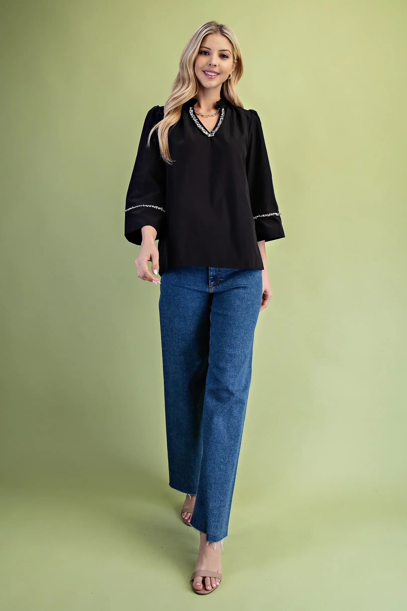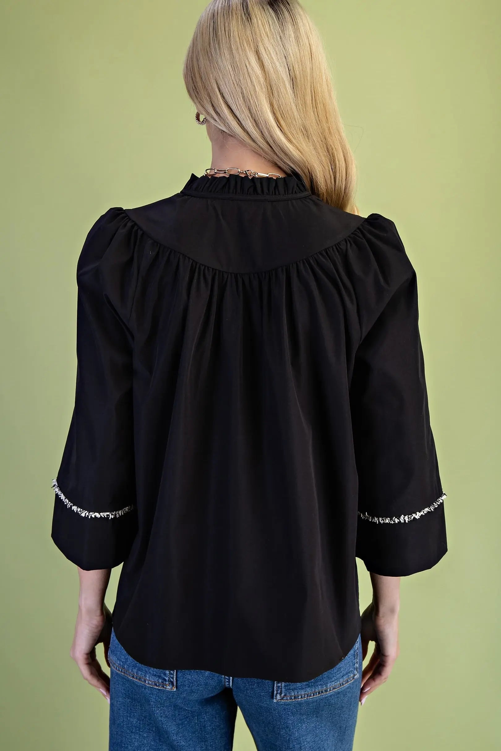 A black V-neck pullover top featuring delicate frayed trim along the neckline and the three-quarter-length sleeves. The neckline is accentuated by a soft ruffle collar that adds a touch of femininity and texture to the design. This piece blends casual comfort with elevated detailing, making it versatile for both relaxed and polished looks. Model is 5’7” tall and is wearing a size small.