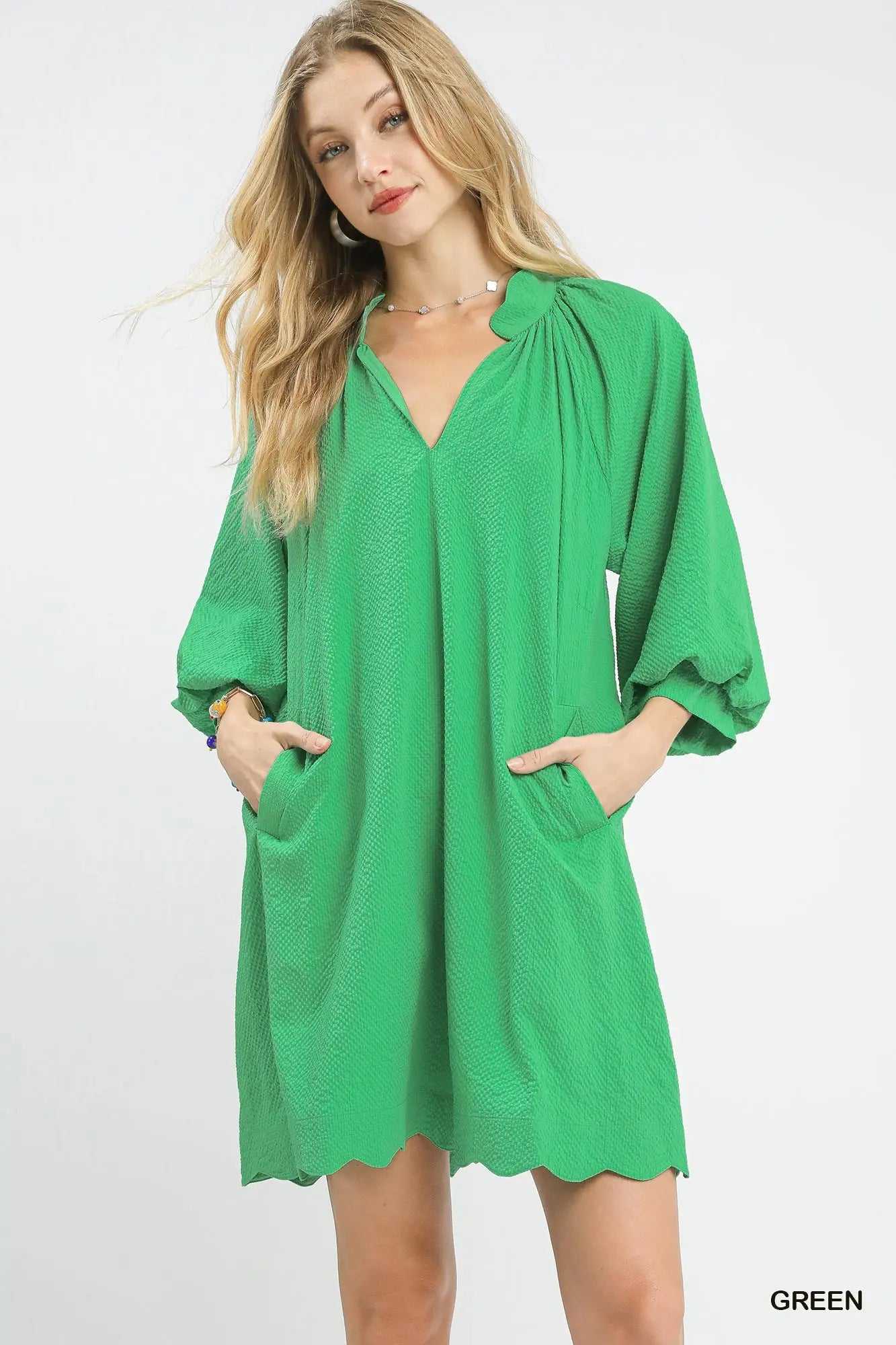 Fresh, feminine, and effortlessly chic — this lined green dress is made for all your springtime moments. The beautifully textured fabric is complemented by a scalloped collar and matching scalloped hem for a sweet, polished finish. Flowy 3/4 balloon sleeves add soft volume, while the relaxed silhouette keeps it comfortable and flattering. And yes… it has pockets!